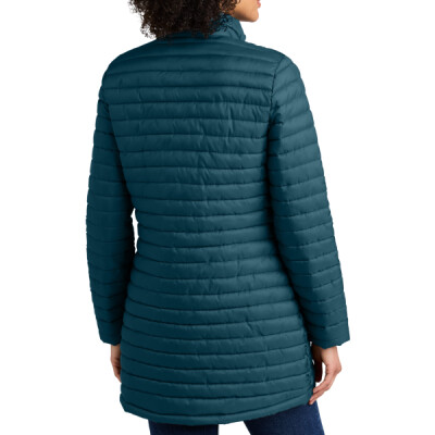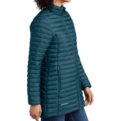 Designed with traditional quilt lines, this insulated full-zip is built for warmth and weather-resistant performance. Features include full-length interior storm flap with chin guard, exposed, molded zippers with Eddie Bauer logo pulls, elastic cuffs, zippered hand pockets and a slight drop tail hem. Includes a decoration access pocket. Packs into zippered left hand pocket. Longer length with a double zipper. Contrast Eddie Bauer heat transfer logo on right hem. Made of 100% polyester ripstop and 5.4-ounce, 100% polyester blown fill. PU coating on back of shell. Durable water-repellent (DWR) finish.